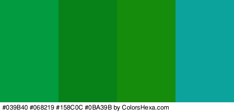 The Hex Color Codes in #039B40 #068219 #158C0C #0BA39B are #039B40 #068219 #158C0C #0BA39B .