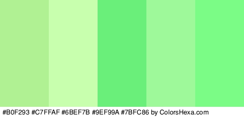 The Hex Color Codes in #B0F293 #C7FFAF #6BEF7B #9EF99A #7BFC86 are #B0F293 #C7FFAF #6BEF7B #9EF99A #7BFC86 .
