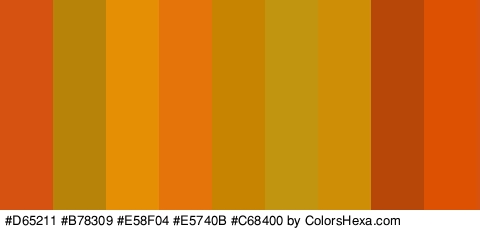 #D65211 #B78309 #E58F04 #E5740B #C68400 #C1950F #CE8F06 #B74609 #DD5202 is a palette in Bronze category and belongs to Brown Sub Category. Download the different hex colors of #D65211 #B78309 #E58F04 #E5740B #C68400 #C1950F #CE8F06 #B74609 #DD5202. There are a total of 9 different colors which are #D65211 #B78309 #E58F04 #E5740B #C68400 #C1950F #CE8F06 #B74609 #DD5202 . Find the color hex picture of #D65211 #B78309 #E58F04 #E5740B #C68400 #C1950F #CE8F06 #B74609 #DD5202.