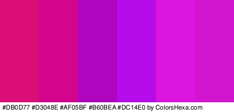 The Hex Color Codes in #DB0D77 #D3048E #AF05BF #B60BEA #DC14E0 #D114CD are #DB0D77 #D3048E #AF05BF #B60BEA #DC14E0 #D114CD .